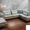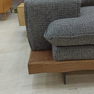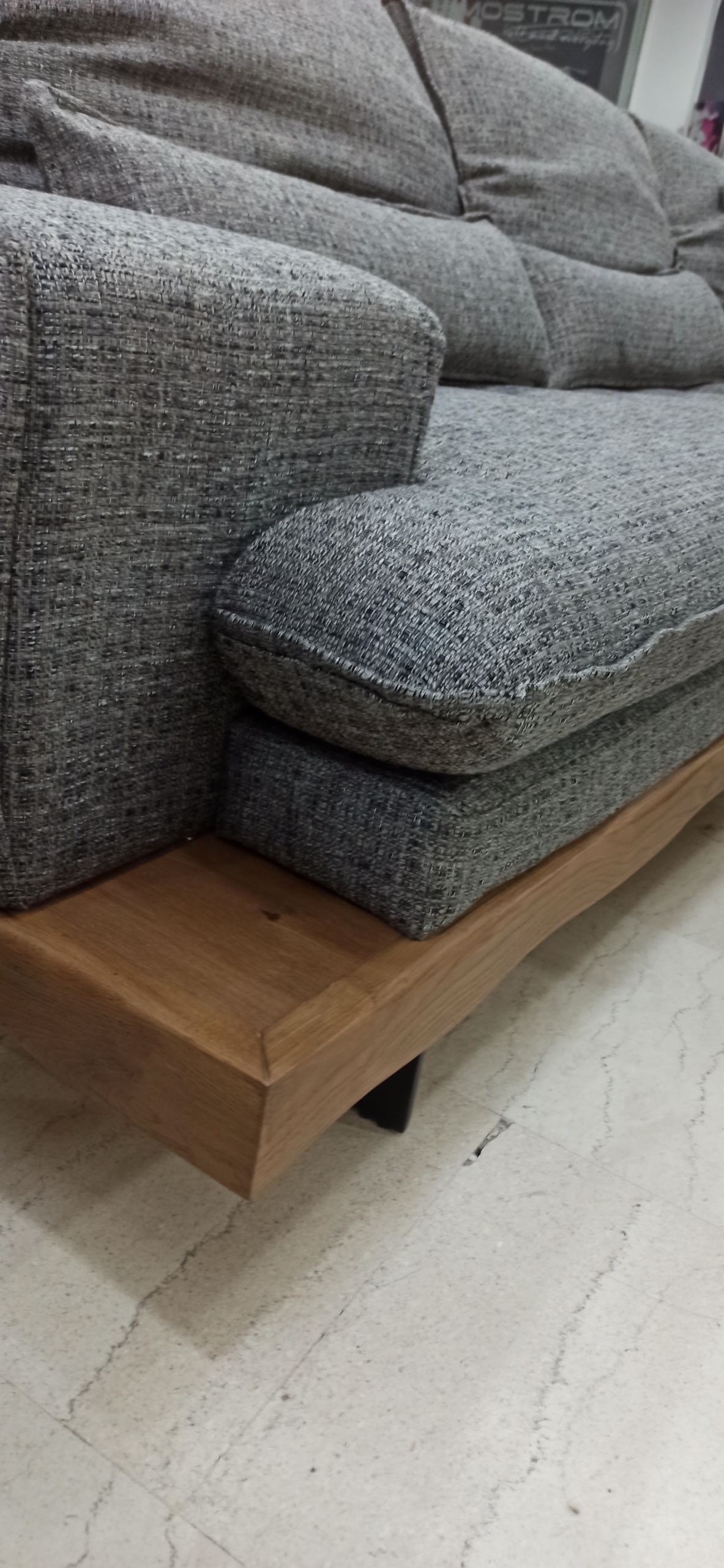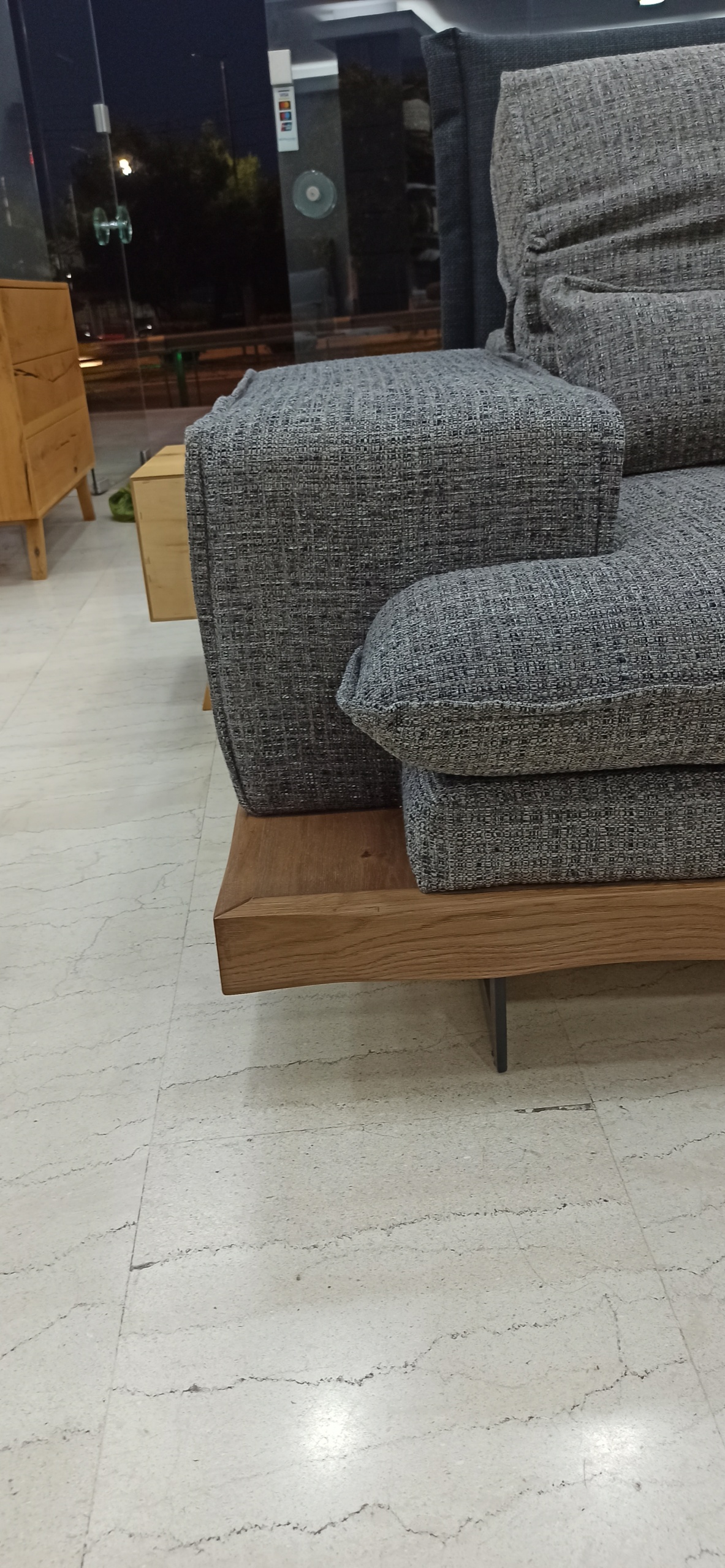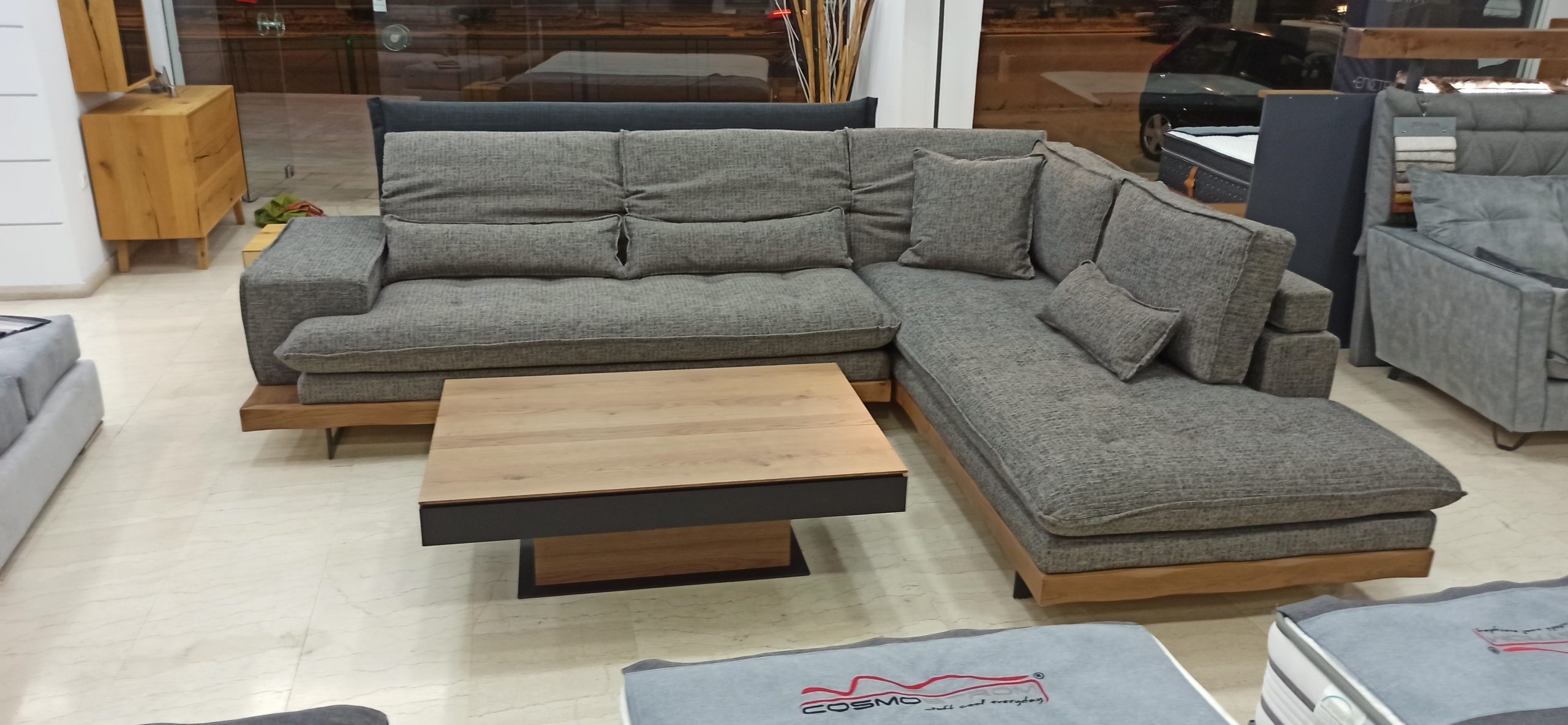 Γωνιακός καναπές ιδιαίτερου σχεδιασμού με ξύλινη δρυς μασίφ βάση ,σκελετος από οξιά και κοντραπλακέ θαλάσσης μεταλλικά πόδια μπάρες και με ανάκληση στις μαξιλάρες πλάτης.