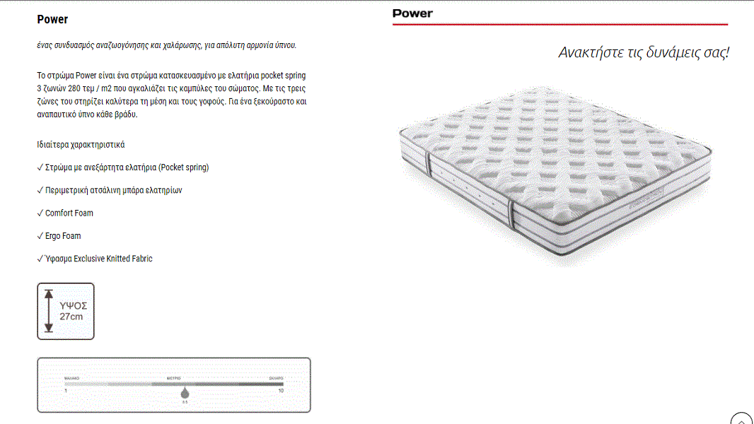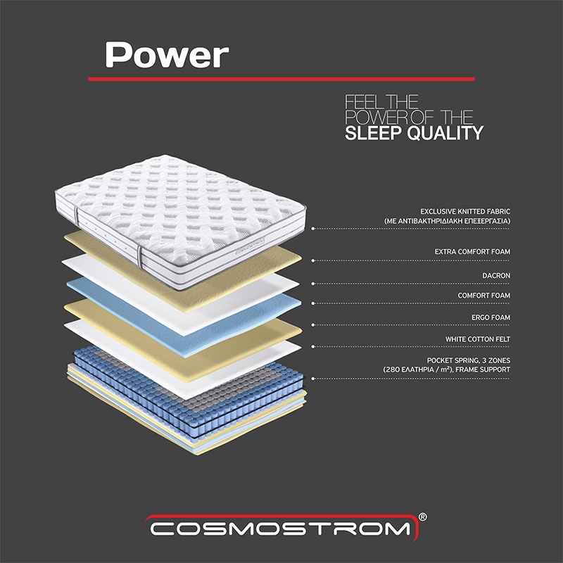 Ανατομικό στρώμα ύψους  27 εκ., κατασκευασμένο με  ελατήριά  pocket spring 3 ζωνών 280 ελατήρια/m2,που αγκαλιάζει τις καμπύλες του σώματος.